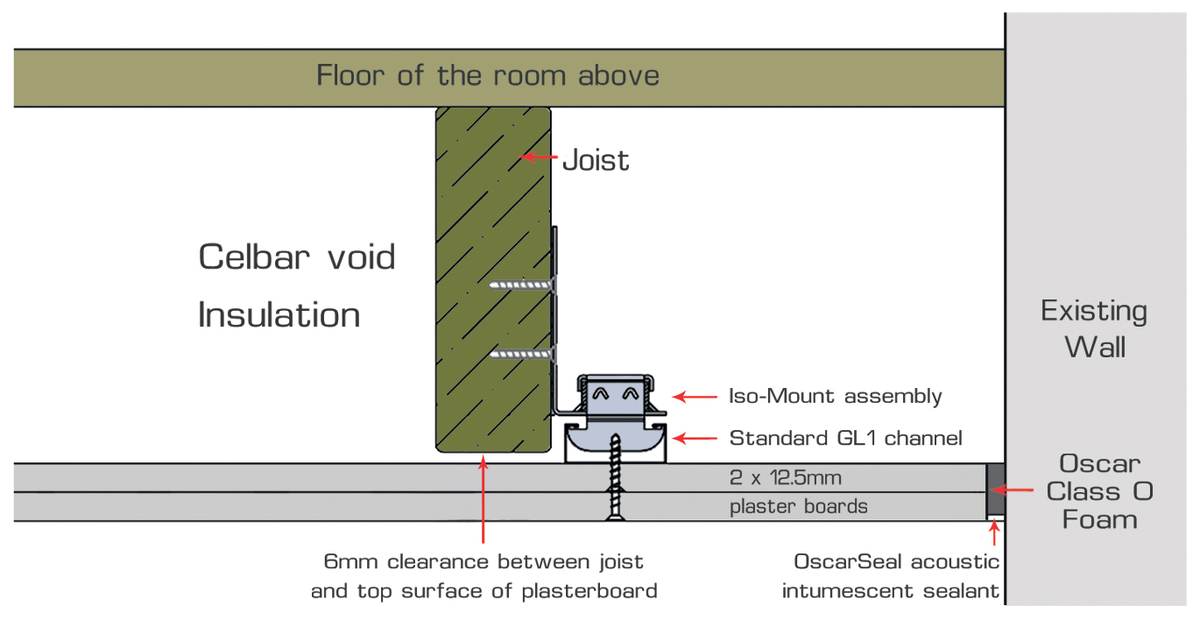 Oscar Iso-Mount Type1 is an isolating acoustic ceiling hanger for timber joist ceilings which significantly reduces transmission of noise from the floor above with minimum ceiling height loss (as little as 5mm). All work is carried out from the room below with no disruption caused to the floor above.